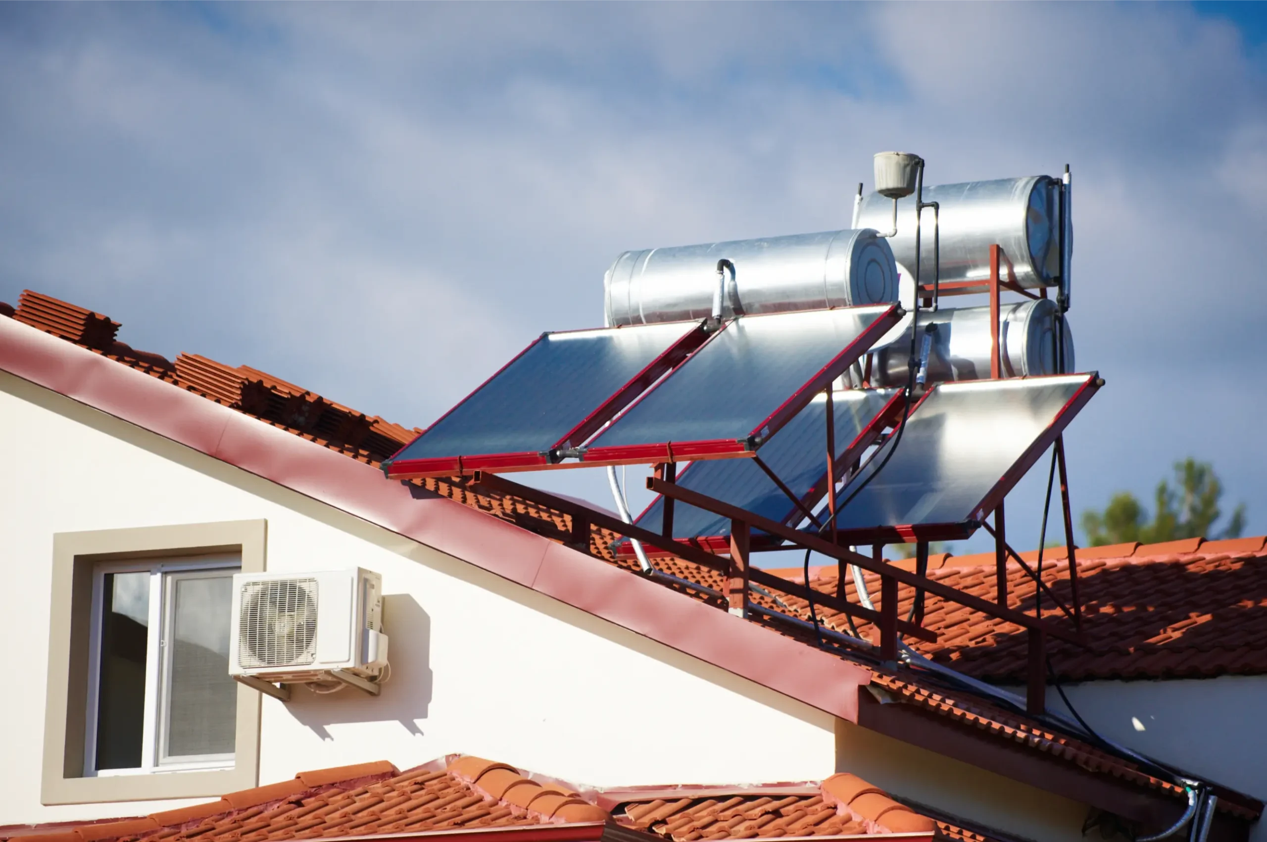 Solar collectors on the roof absorb the sun’s heat and transfer it to water stored in a tank, either directly or via a heat exchanger.
